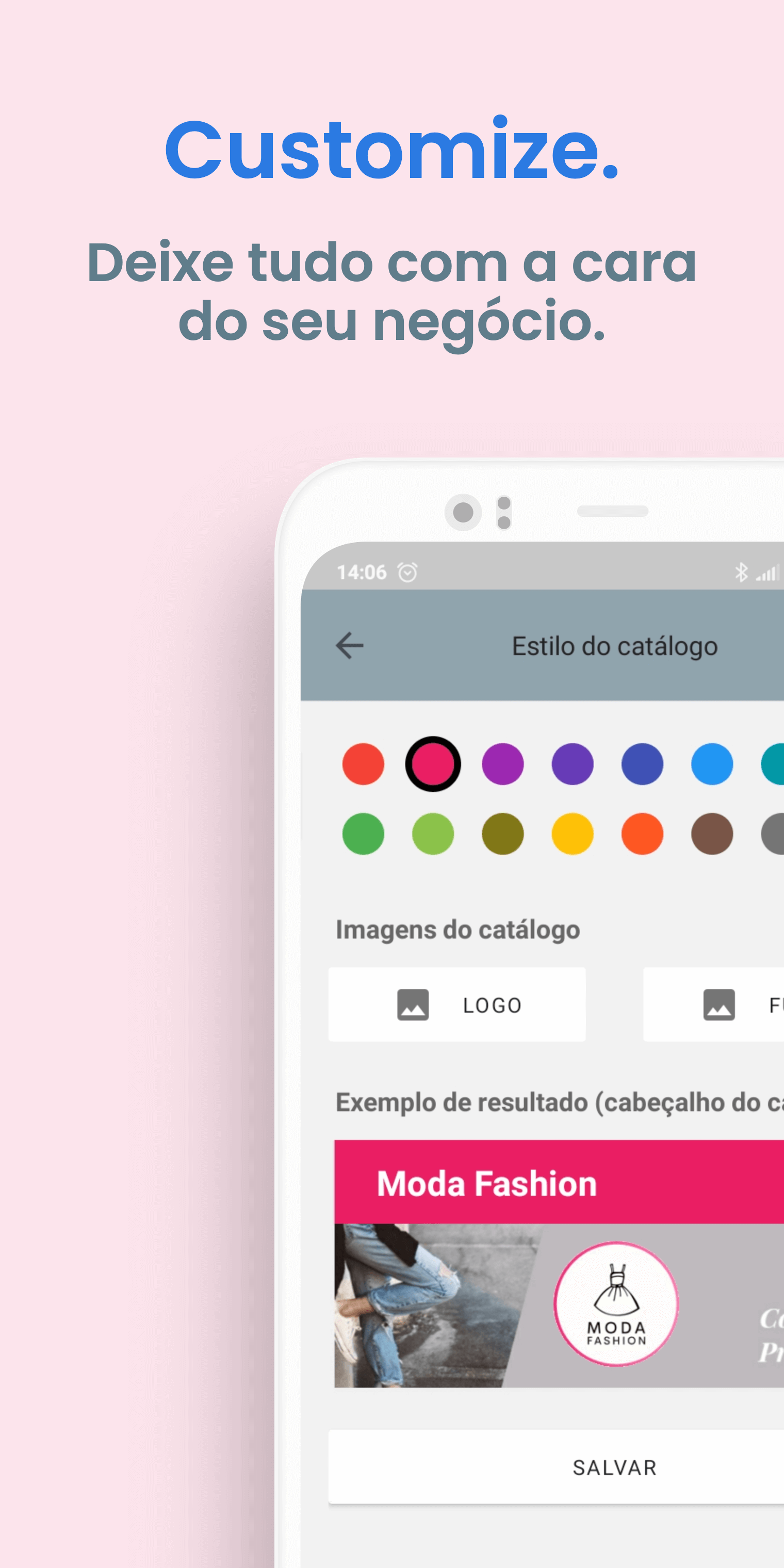 Catálogos personalizados com a marca e as cores da sua empresa.