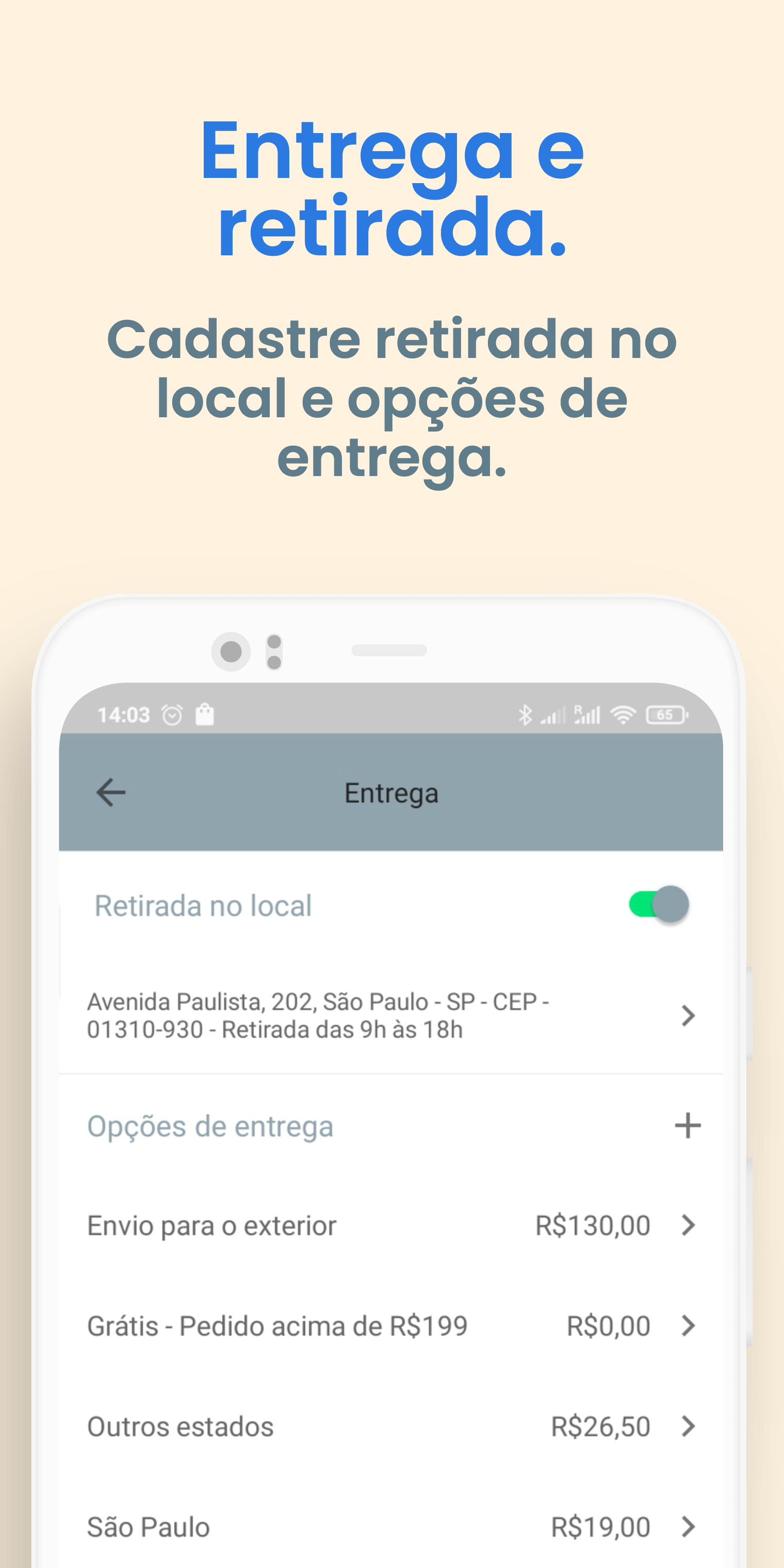 Adicione opções de entrega e retirada que funcionam para o seu negócio, seja por distância, cidade, estado ou entrega grátis.